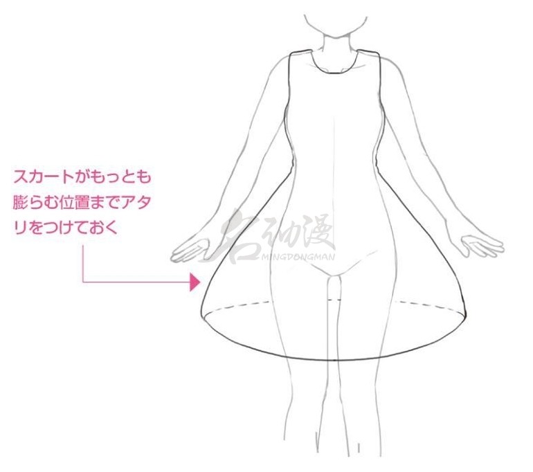 第一步:首先我们先画出一个人体,根据人体的动作画出连衣裙的外轮廓以及造型,方便进行下一步刻画。