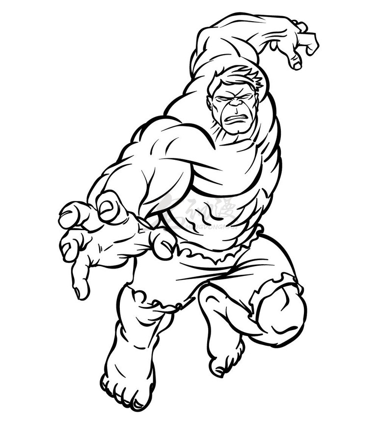 第五步:接下来把绿巨人的腿部完整画好,以及脚的部分。先画他厚厚的小腿和向右伸出的脚。右边的腿将弯曲并向后延伸,以表明他正在向某物跳跃起来的样子。最后再在绿巨人身上添加上细节。如图所示: