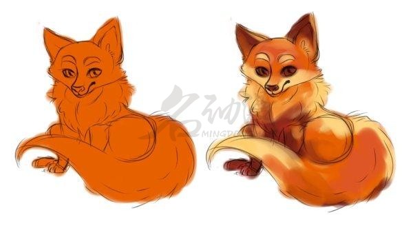 选择一个喜欢的颜色,用涂抹笔触或者排线的方式涂画小狐狸的色彩,然后用其同色系的深色绘制背部的花纹。