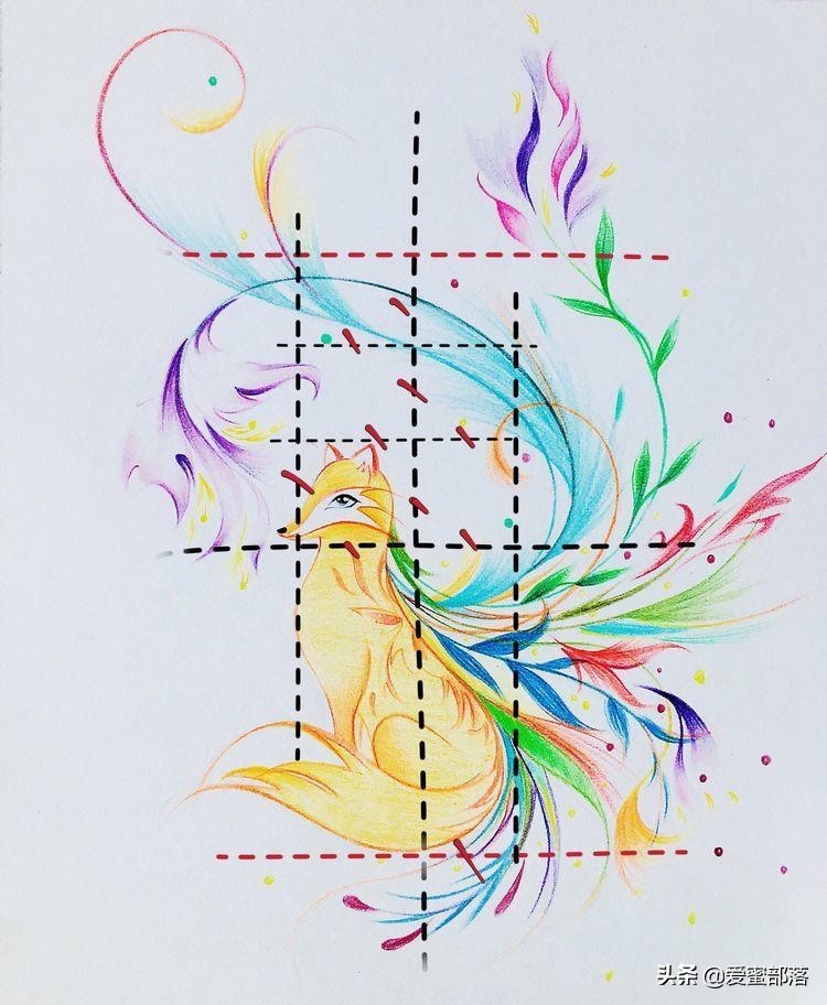 比如:以中心十字点到小狐狸头部最高距离,上方刚好等分画出十字定位线;以中心十字点到小狐狸嘴巴的宽距离,左右两侧等分画出十字线。小狐狸的头部设定在这个十字框格内,具体可见下图勾画分析图。