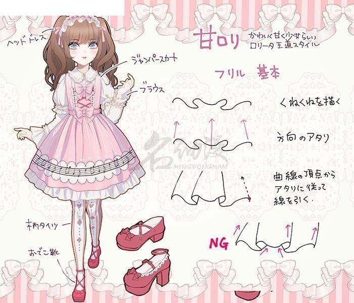 第一步:首先,让我们比较一下真实的洛丽塔与二维角色设计(如魔法女孩和迷你裙女仆服装)的区别。 两者都以相同的主题绘制:双尾,胸前有丝带,泡芙袖子。为了在二维服装中展示其独特性,一般倾向于通过极端表达来增强变形颜色,例如结构不明的巨型丝带或带有点线的褶皱。