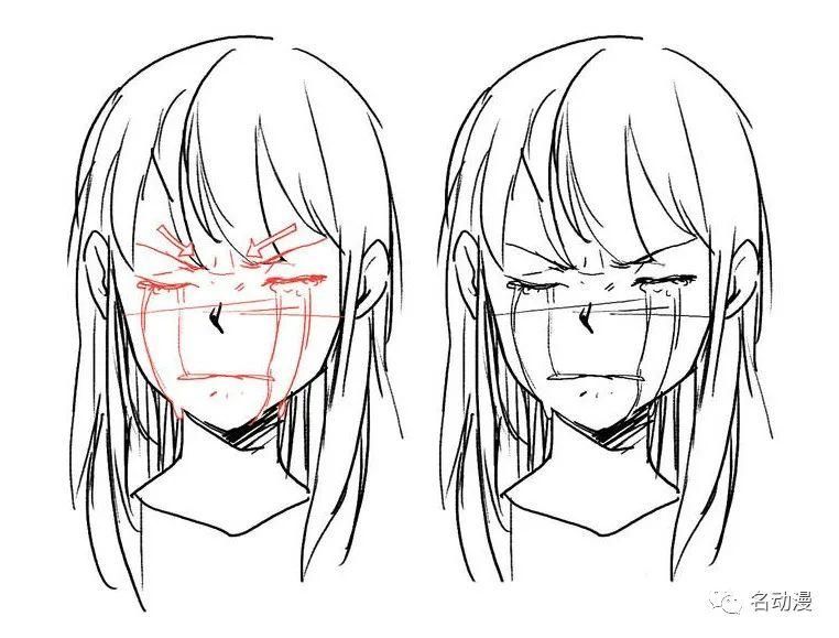 除了“泪流满面”型可以表现哭泣以外,其实我们还需要脸部其他结构的“联动”,让人物的情绪愈加明显。