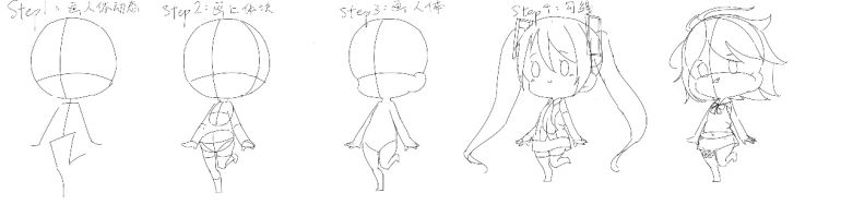二头身Q版人物:最弱小无助可爱到爆炸的形象,由于需简化过多,动作局限性较大。绘制时注意将整个身体缩小,头部要大于肩部宽度才能协调。