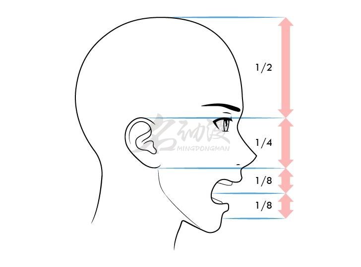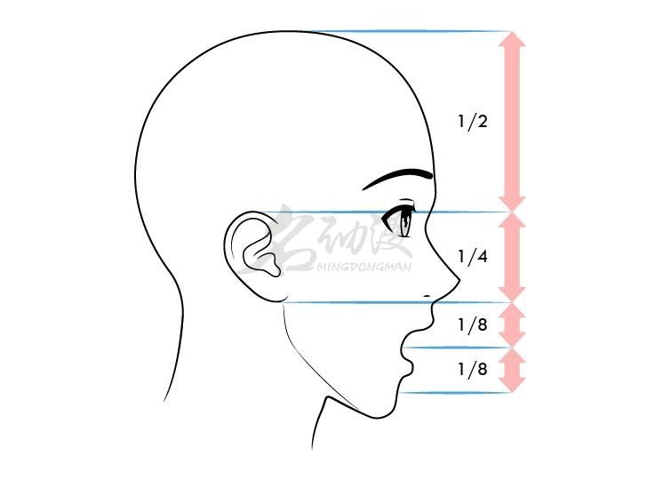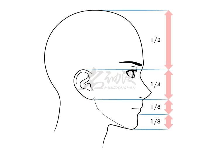 如图例所示,可以划分动漫风格的男性面孔。在头部的水平中点下方画出眼睛。这一点也将是耳朵的顶部。将耳朵和鼻子的底部位置放在眼睛顶部和下巴底部之间的中间位置。最后将下唇放在鼻子底部和底部之间,然后将嘴拉到略高于它的位置。