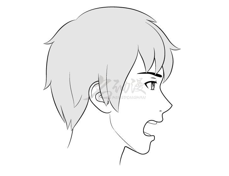 对于惊讶的脸,将眉毛抬高(尤其是前端)并将眼睛拉得比平时更大。将下巴向下画(与张开嘴的示例相同),但用更平滑的曲线画出嘴巴,而不是深入头部。这样做的原因是嘴巴会在那个表情中形成一个类似“O”的形状,嘴唇的两侧实际上被拉向鼻子。
