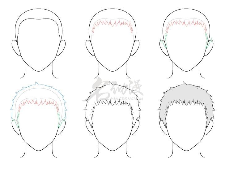 从头顶开始,一直延伸到发际线以外的区域,使得中间的线条略长于两侧的线条。从头顶周围开始,然后向下靠近耳朵底部,再次添加侧面部分的鬓角。最后在头发的后部添加一些“屋顶状”形状的头发,头发向下倾斜。还可以添加一些从耳朵下方伸出的线条。