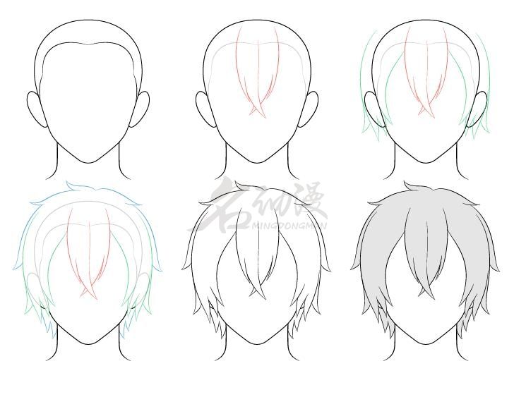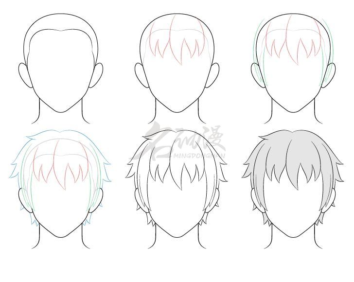 首先在画好的头型上画出前面碎发,且使碎发的底部靠近发际线的位置。接着画上脸颊两侧的鬓角,也靠近发际线位置。在头顶部(后面)周围稍微画出“散开式”的头发。要完成线条,接着被头发覆盖的头部顶部线条擦除掉,然后添加上阴影(灰色)。