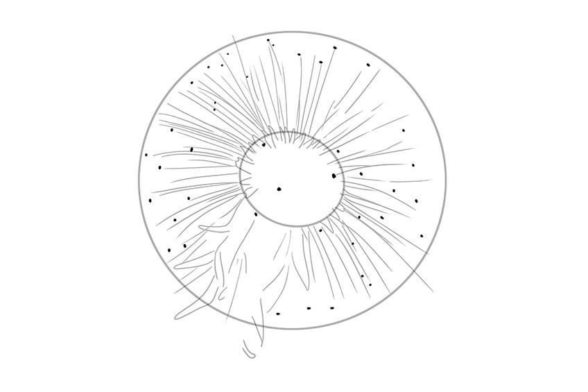 现在我们已经有了种荚和种子的轮廓,我们可以开始画出我们的蒲公英的实际种子线条。从中央的豆荚开始,你现在可以画几条线,向周围的圆圈延伸出去。尽量不要将这些线一直延伸到第二个圆的边缘,因为我们还需要添加种子的末端。