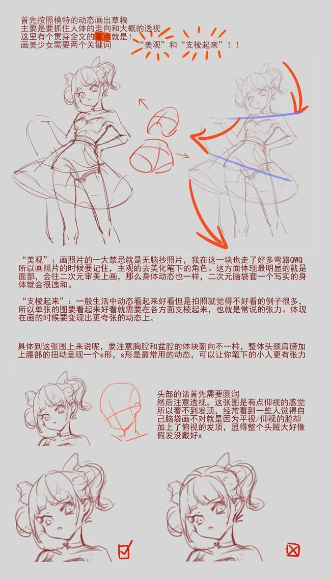 “支棱起来”:一般生活中动态看起来好看但是拍照就觉得不好看的例子很多,所以单张的图要看起来好看就需要在各方面支棱起来,也就是常说的张力。体现在画的时候要变现出更夸张的动态上。