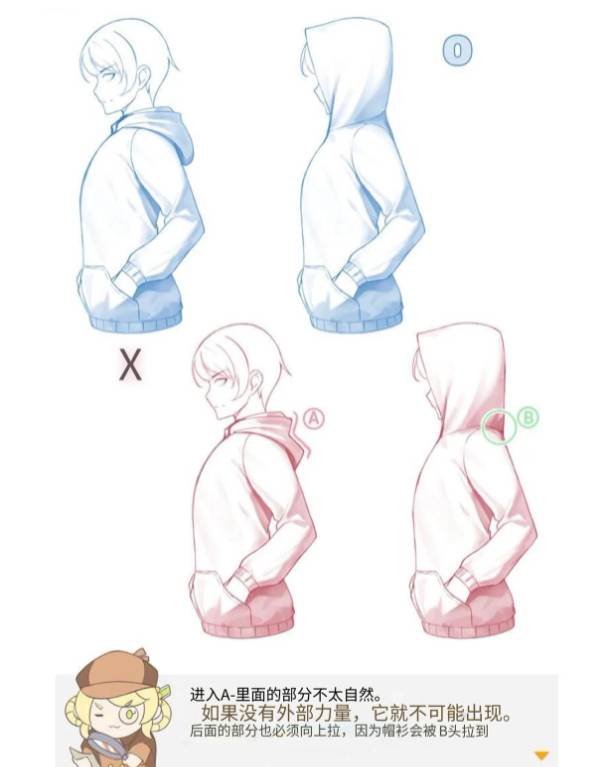 后面的部分也必须向上拉,因为帽衫会被B头拉到。