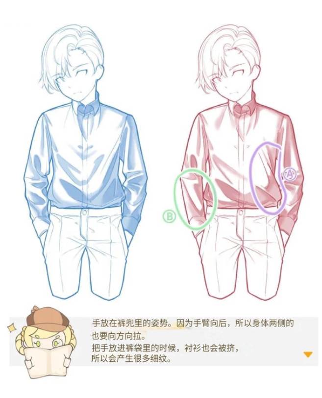 手放在裤兜里的姿势。因为手臂向后,所以身体两侧的也要向方向拉。