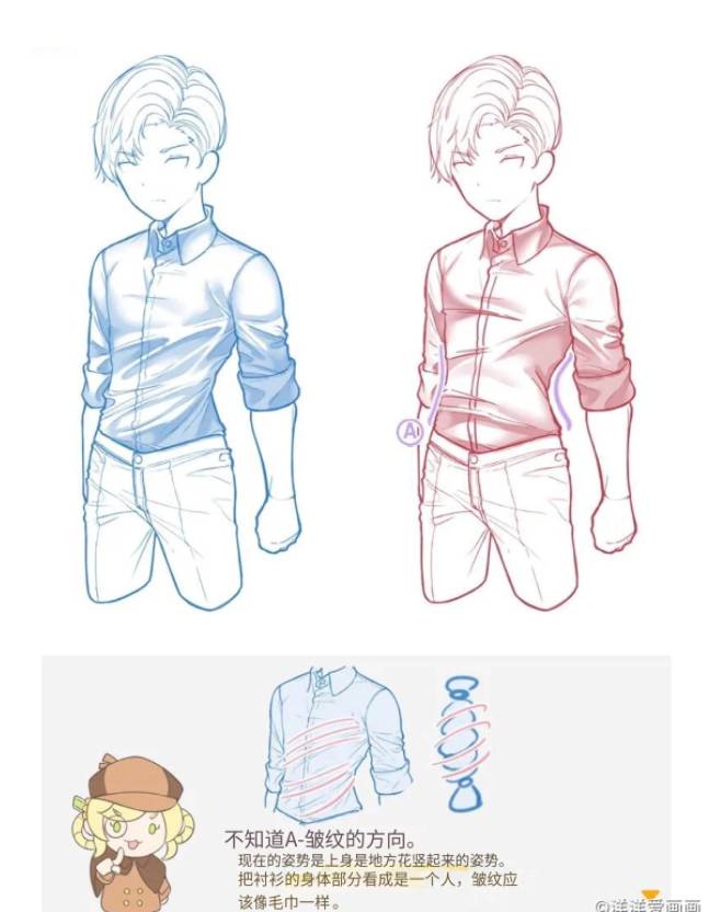 把衬衫的身体部分看成是一个人,皱纹应该像毛巾一样。