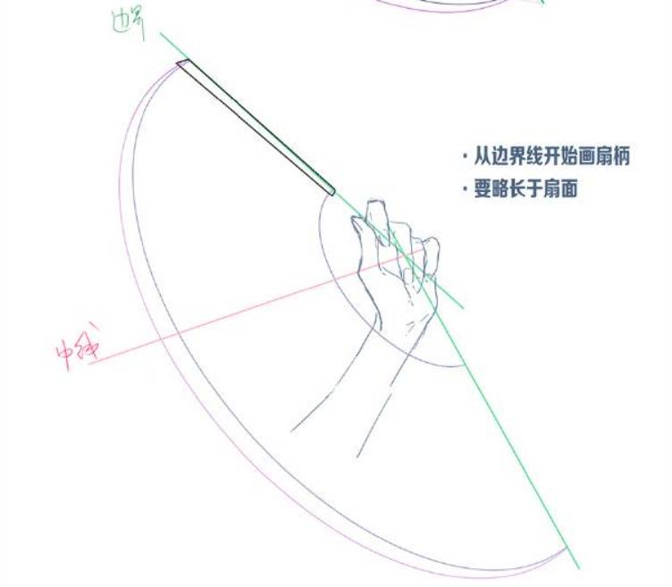 3、从边界线开始画扇柄,要略长于扇面。