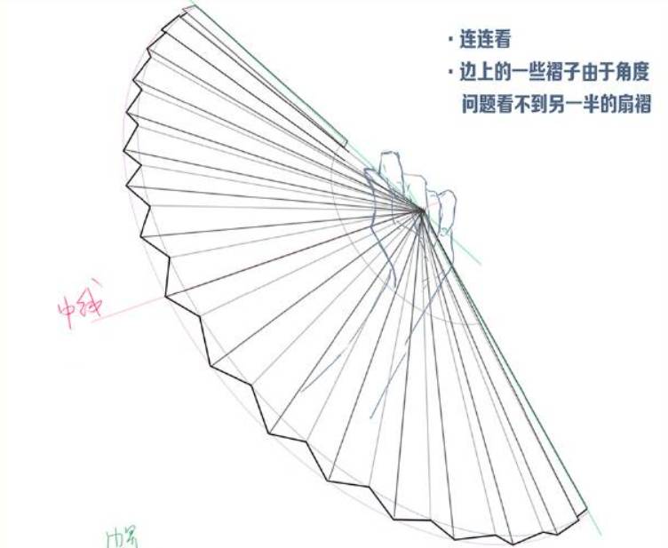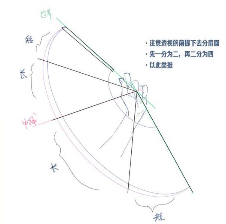 4、注意透视的前提下去分扇面。先一分二,再二分四,以此类推。