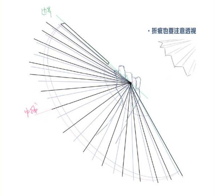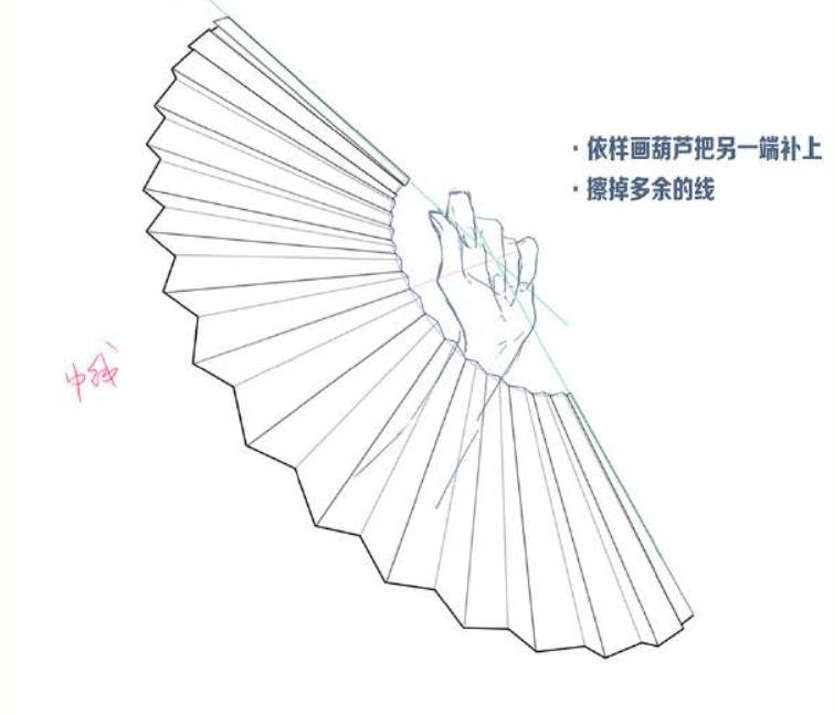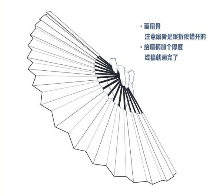 9、接下来就是画扇骨了,注意扇骨跟折痕是错开的。给扇柄加个厚度,最后就画完了。