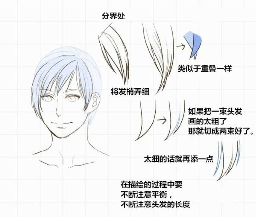 分界处,类似于重叠一样。将发梢弄细。如果把一束头发画的太粗了,那就切成两束好了。太细的话就再添一点。在描绘的过程中要不断注意平衡,不断注意头发的长度哦。