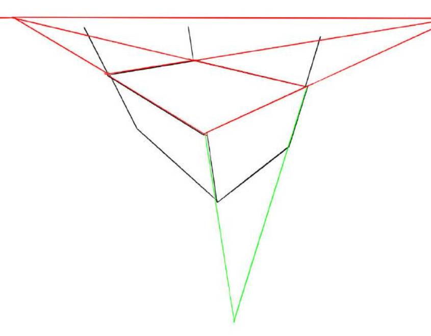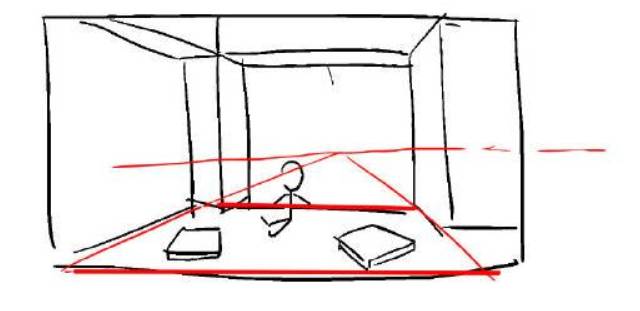 假设房间地面和水平线是平行的,那可以根据另外两条线确定地面的消失点在哪里,根据这个消失点再画一条水平线,就可以得到地面的水平线了,所有放在地面上的人和物,有一个面的消尖点肯定在这同一个水平线上。