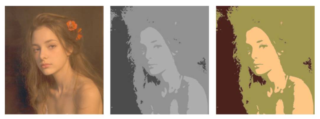 左边是原参照图,这照片中的灰调子面积很大且几乎没有高亮区域所以大致将画面分成三个色调即:亮灰调,中灰调和黑调。然后根据简化过的色调再简化一下每个色调的基色,这样整个画面里就大概被分成了,最亮的黄色调,稍暗的绿色调和最黑的红色调。这就是整张画的素描大关系和色彩大关系。