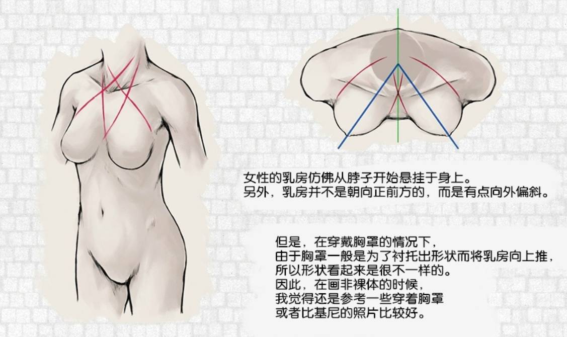 女性的乳房仿佛从脖子开始悬挂于身上。另外,乳房并不是朝向正前方的,而是有点向外偏斜。但是,在穿戴胸罩的情况下,由于胸罩一般是为了衬托出形状而将乳房向上推。所以形状看起来是很不一样的。因此,在画非裸体的时候,我觉得还是参考一些穿着胸罩或者比基尼的照片比较好。