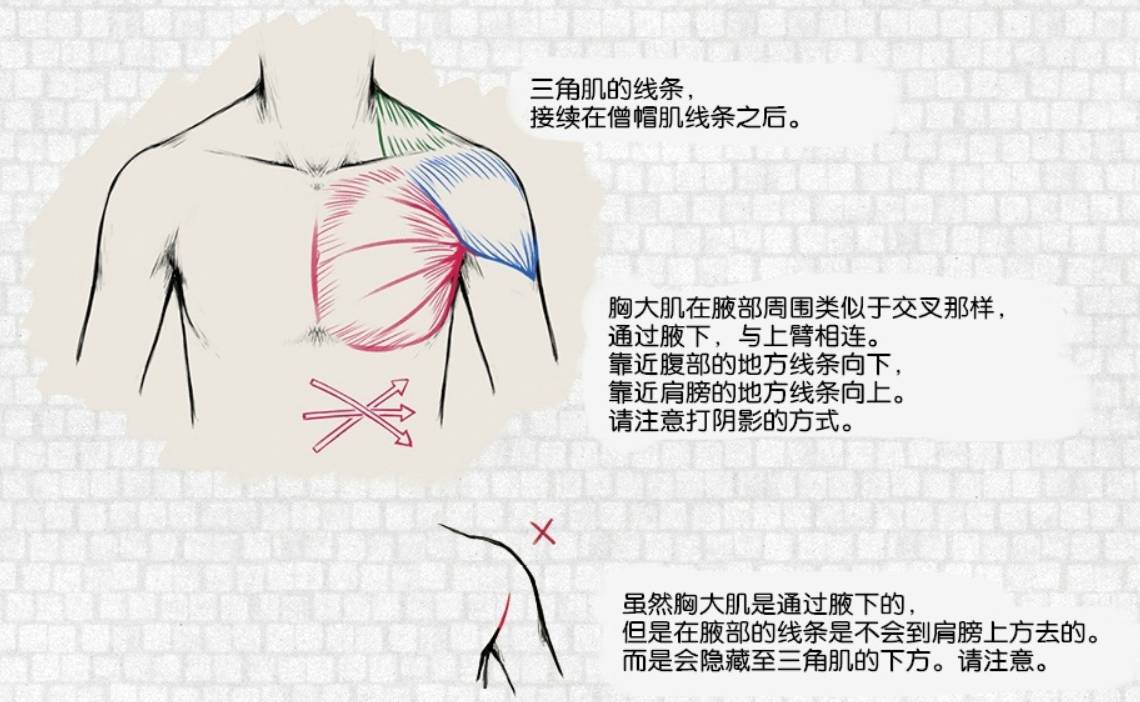 虽然胸大肌是通过腋下的,但是在腋部的线条是不会到肩膀上方去的。而是会隐藏至三角肌的下方。请注意。
