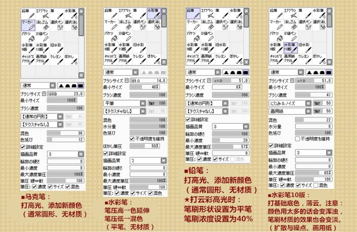 在画天空之外的东西时,也大致是这个设定。只不过,在画天空的时候,我只用铅笔工具。如上面说的那样,笔刷形状设置为平笔且将浓度设置为40%。在以后会进行说明。