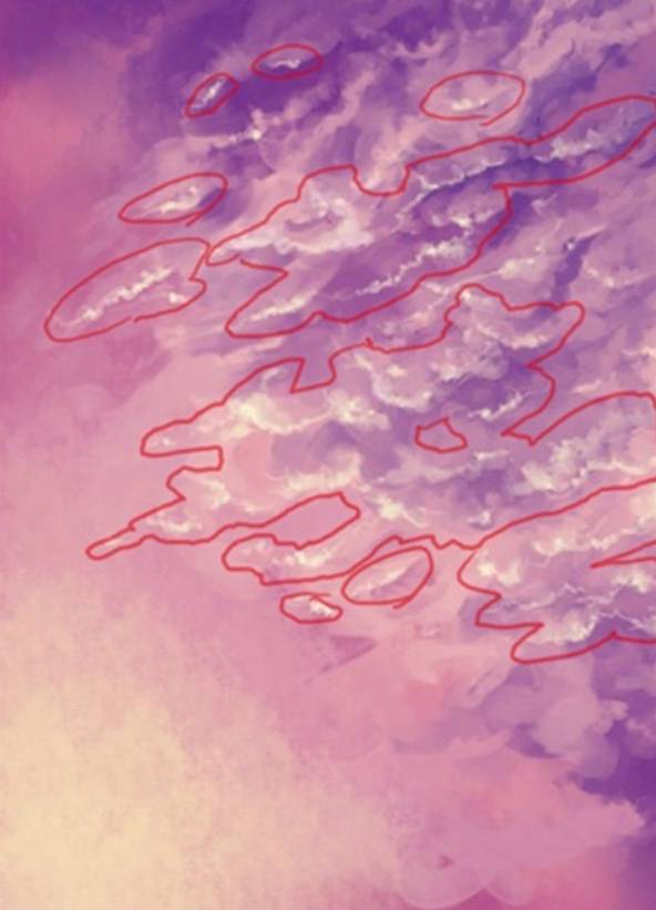 水彩笔从最开始就一直将笔刷形状设定为平笔,不过现在我打算把关于铅笔的平笔来介绍一下。朝霞与晚霞中细节深入的高光部分(用红笔勾出的部分,铅笔工具→笔刷浓度40%→将笔刷形状设定为平笔)是这样的设定。当你描绘出细致锯齿状的云彩轮廓的话,会发现很容易就有云彩的感觉了。左边天空的高光,是用铅笔画出锯齿部分后,再用水彩笔将不自然的部分融合一下而已,只做这几步就变的很有感觉了。
