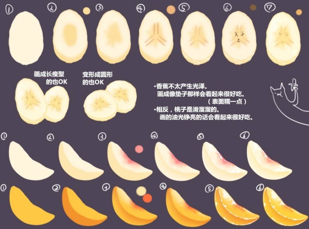 画条可爱的香蕉哦,按照图中步骤绘画即可。画成长瘦型的也OK,变形成圆形的也OK。香蕉不太产生光泽,画成像垫子那样会看起来很好吃。(表面糯一点)相反,类似桃子之类的是滑溜溜的,画的油光铮亮的话会看起来很好吃。