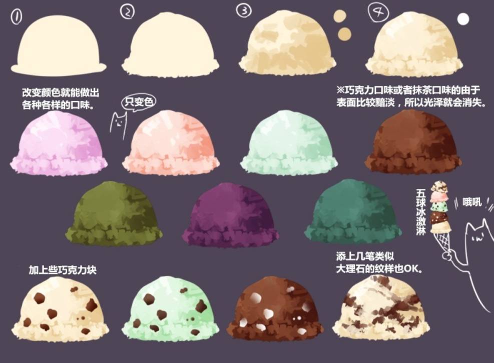 接下来画冰淇淋甜品咯。大家按照图中步骤绘画哦,也可以改变颜色就能做出各种各样的口味。巧克力口味或者抹茶口味的由于表面比较黯淡,所以光泽就会消失。大家在绘画过程中可以添上几笔类似加上些巧克力块,大理石的纹样也OK。