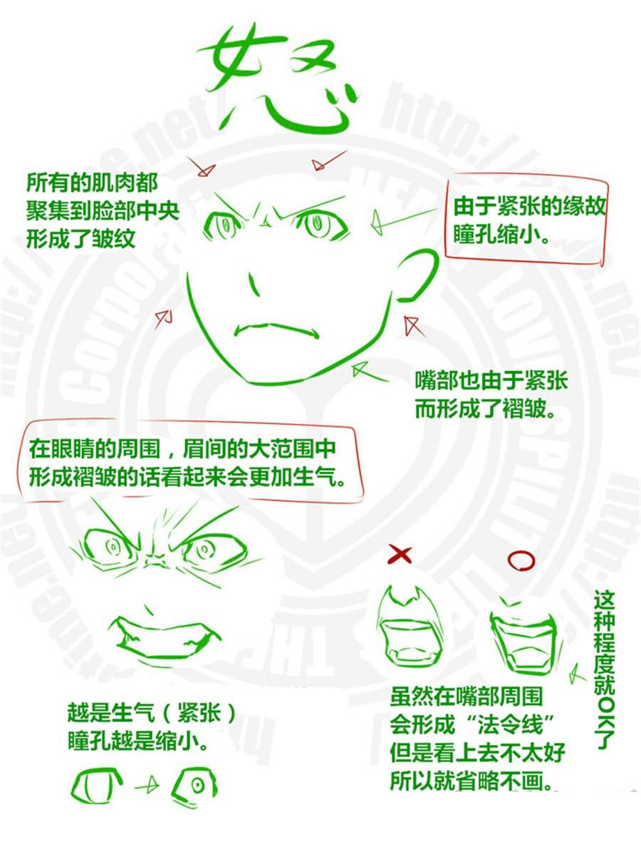 如果非常生气的话,在眼睛的周围,眉间的大范围中形成褶皱的话看起来会更加生气。越是生气(紧张),瞳孔越是缩小。生气时,虽然在嘴部周围会形成“法令线”。但是看上去不太好,所以就省略不画了。
