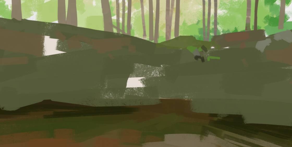 树林由远到近逐渐变暗,加深一些。找出石头的暗部及死角区域,简单二分画出石头的体积,这里需要注意石头暗部的疏密变化,这会导致你的整体画面是否有好看的节奏哦!