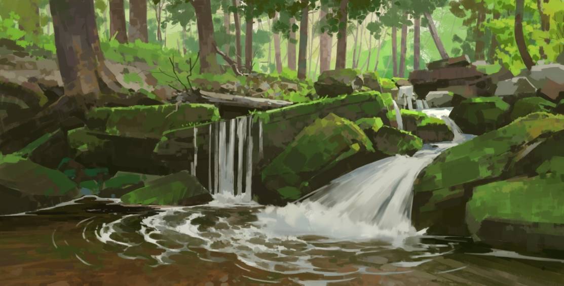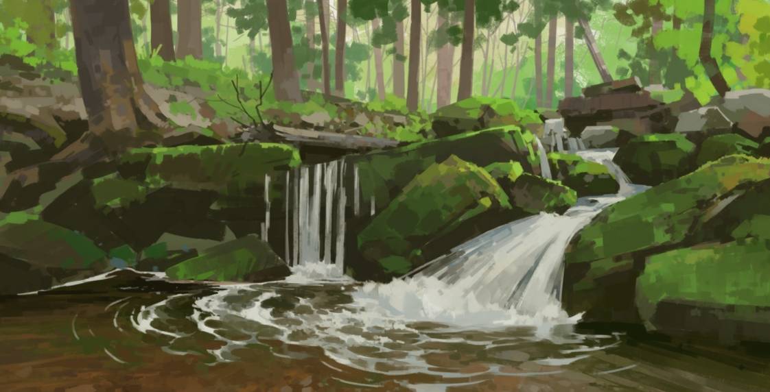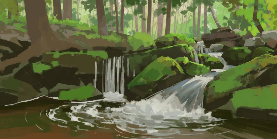 画出溪流的位置。通过增加青苔,让石头的部分变得丰富起来。注意青苔面积大小的控制和形状变化,不能太过整块,得有正负形的穿插关系。