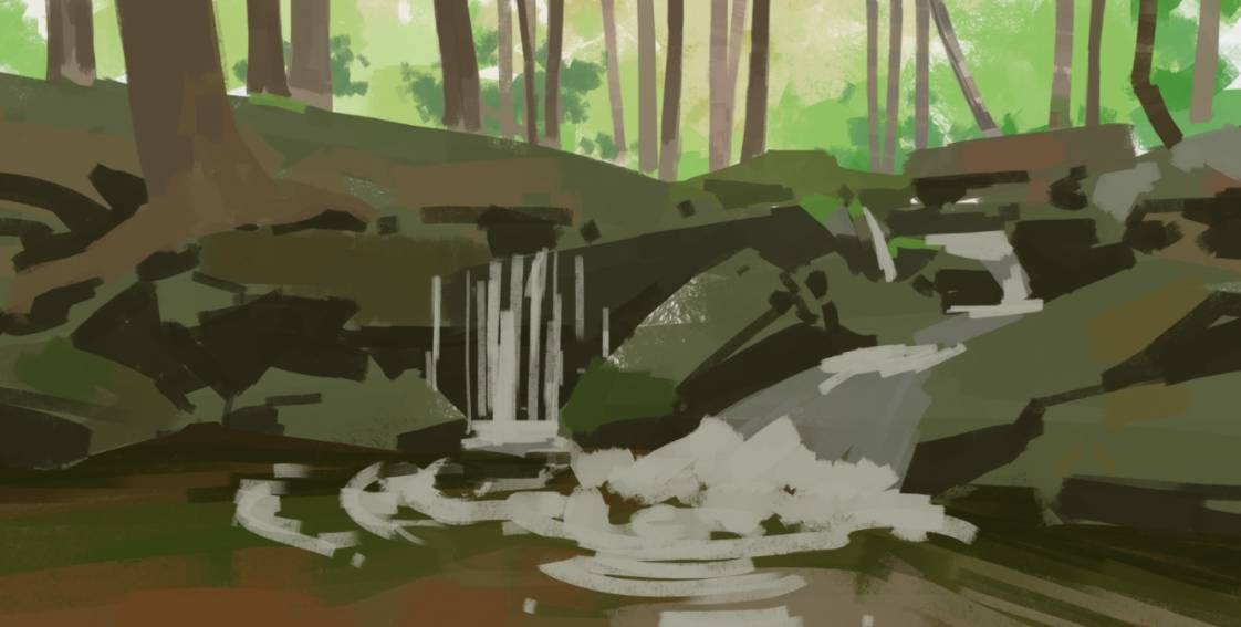 绘画之前,大家需要大致区分出背景:远景树林、中景石头、前景水的位置和色彩差别。注意这里的光线是背景亮,类似逆光的效果。