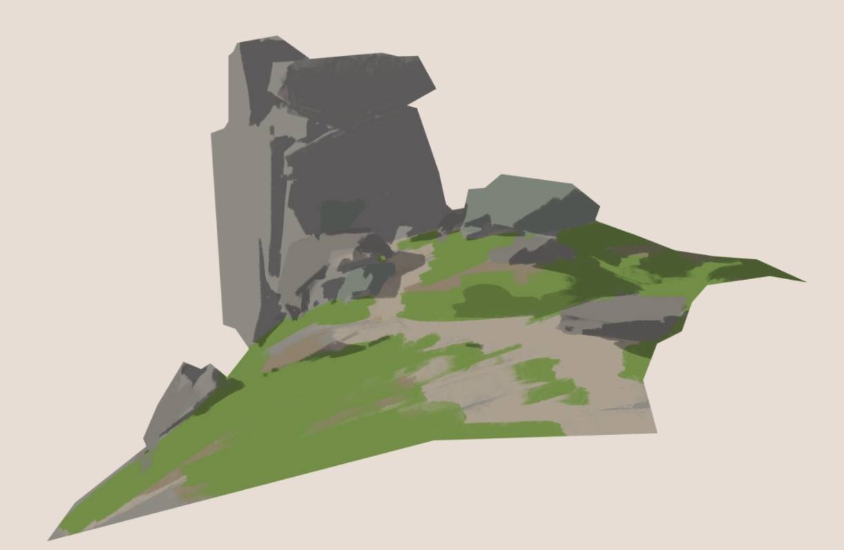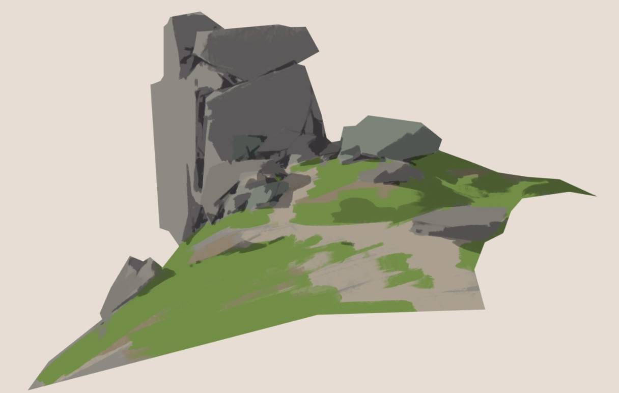 先绘画定好一个大块石头的主体,强调出它的亮灰暗三个面。从而就可以确定它的体积(这个角度明显的只能看到两个面的体积)。注意切割点的位置,一般尽可能黄金切,这样可以尽量避免石头没有整体感。