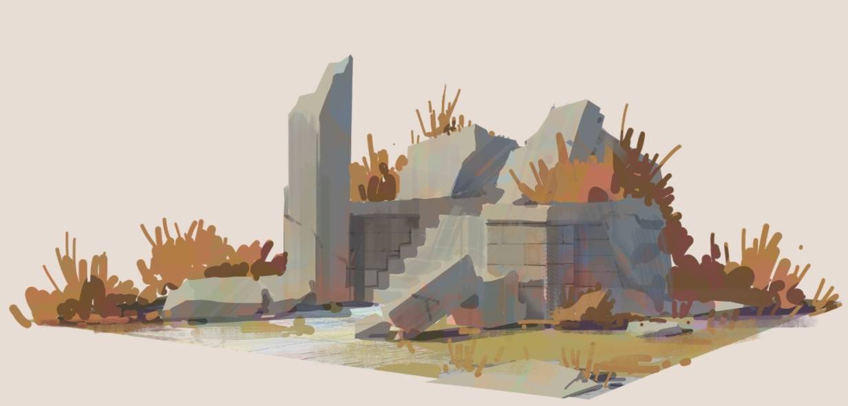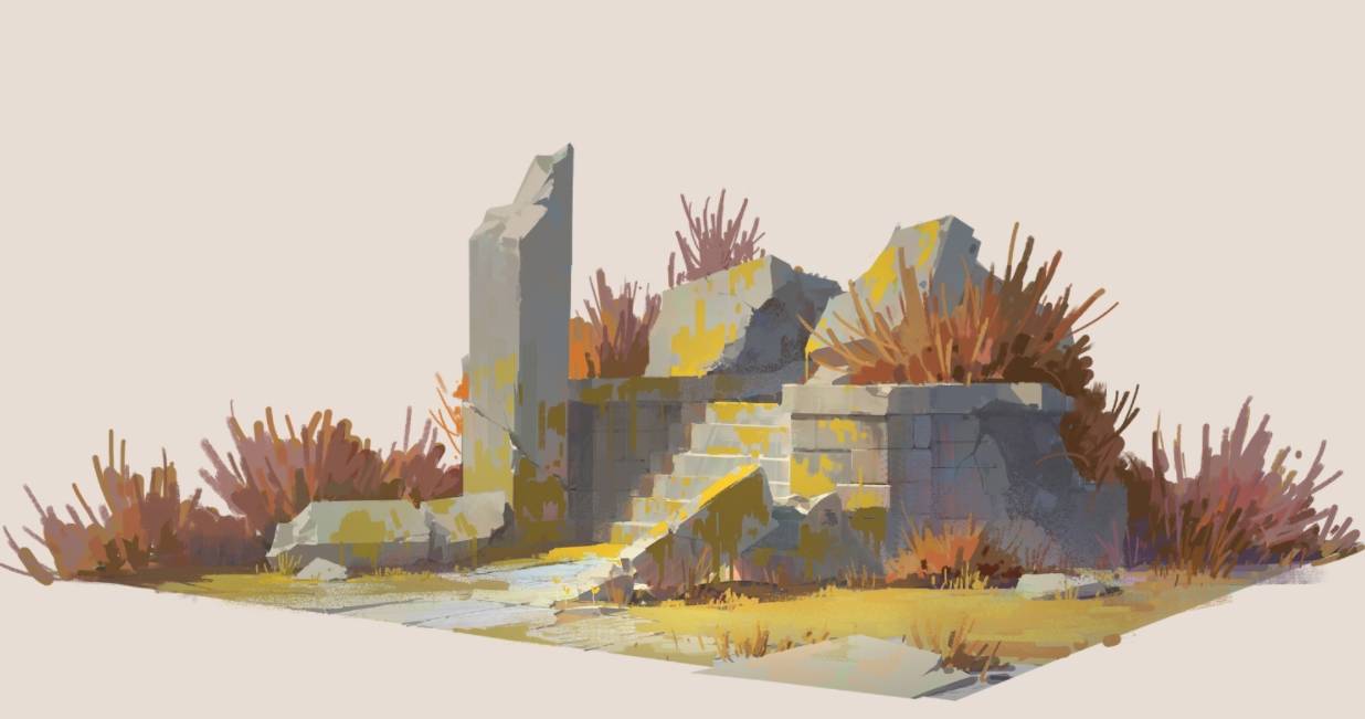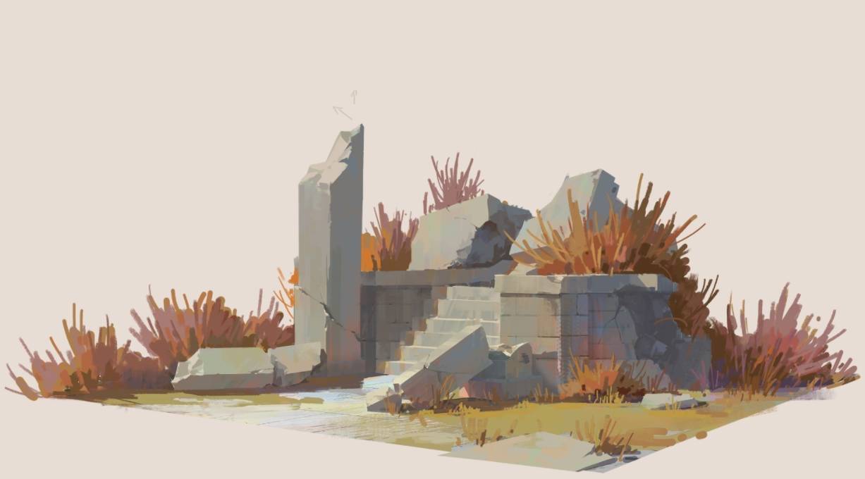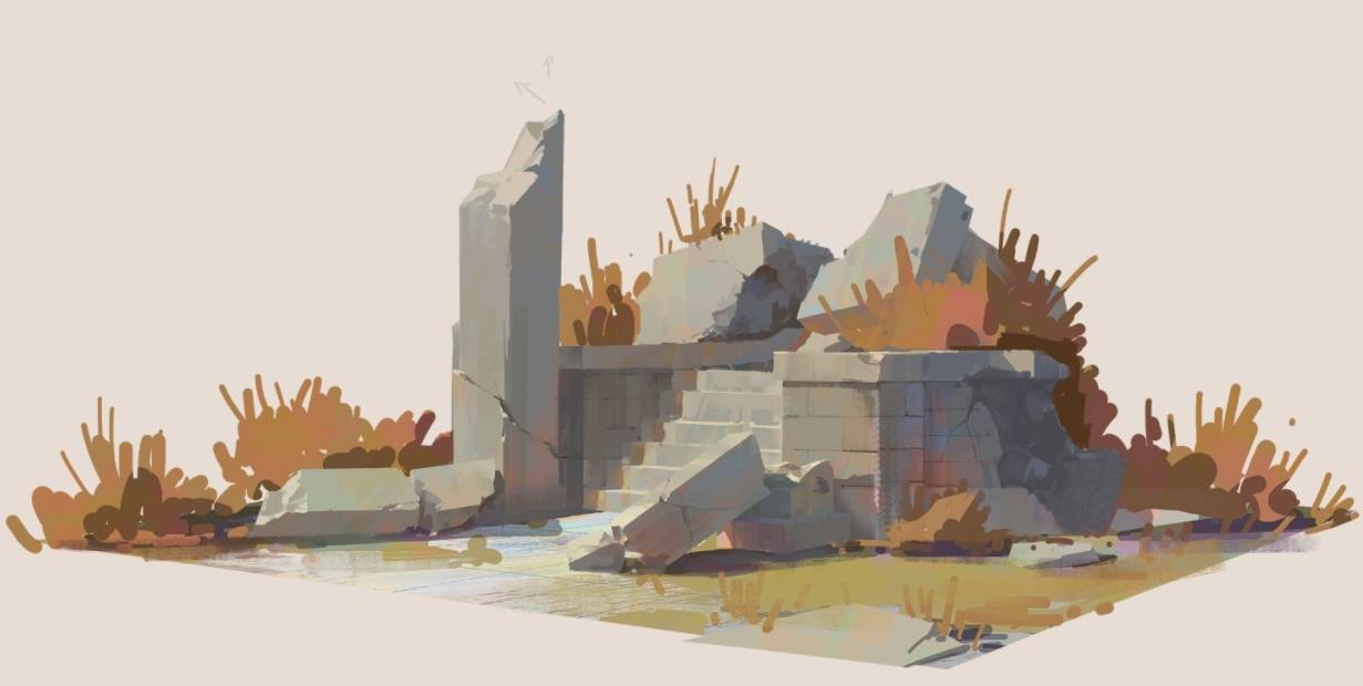 通常我画废墟的时候,我都是先完整画出全部的石头,再去切割出变化来。切割的时候,要注意黄金比的断裂位置,硬线条和软线条的结合。