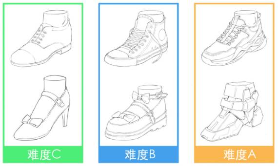 我们为大家准备6种鞋子类型,分为三个难度,同学可以根据自己能力来挑战一下,一起冲鸭!
