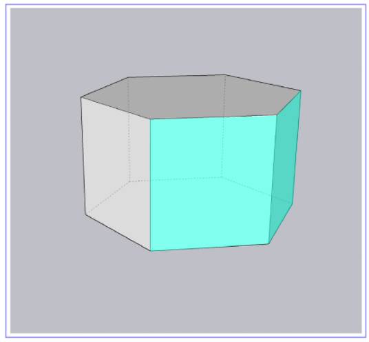 在一个平面进入透视状态下我们知道是存在透视衰减,那么一个进入透视状态的转折面会怎么样呢?我们来看一下,观察下图的六边体,青色面积区域在转折处发生急剧的透视衰减。