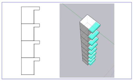 我们可以假想一个带顶篷的阳台,把它依次罗列,在3D软件中我们可以看到青色区域代表顶篷的面积。随着它离消失点越来越接近,它本身的体积在缩小同时,被上一层顶篷遮挡的区域在变大。