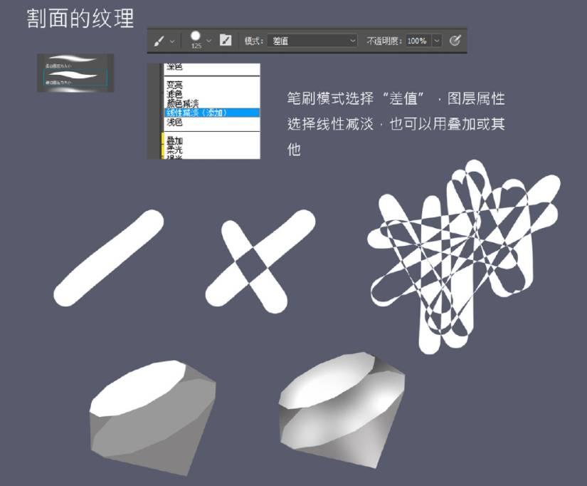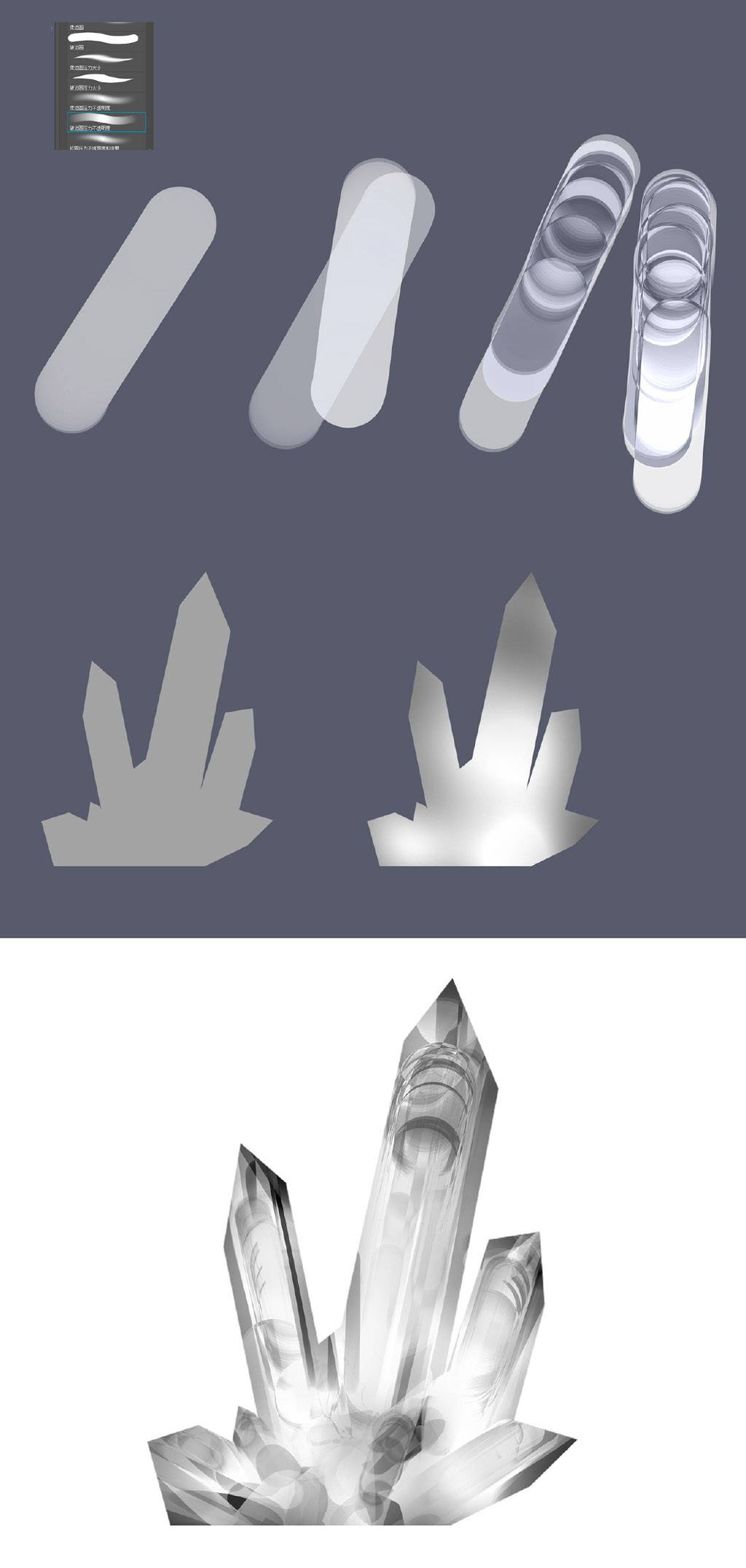 自然结晶的纹理与人工切割类以,用有压力的笔刷多次堆叠就可以实现。