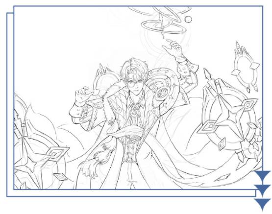 大家先认认真真准备一张线稿。一份好的线稿是成功的一半,线稿阶段我们主要解决画面构图,人物造型、脸型。线稿依据最终的输出状态,选择是画华丽精细一点还是概括一点。简而言之:二次元画精细一点,写实的话不用特别精细。