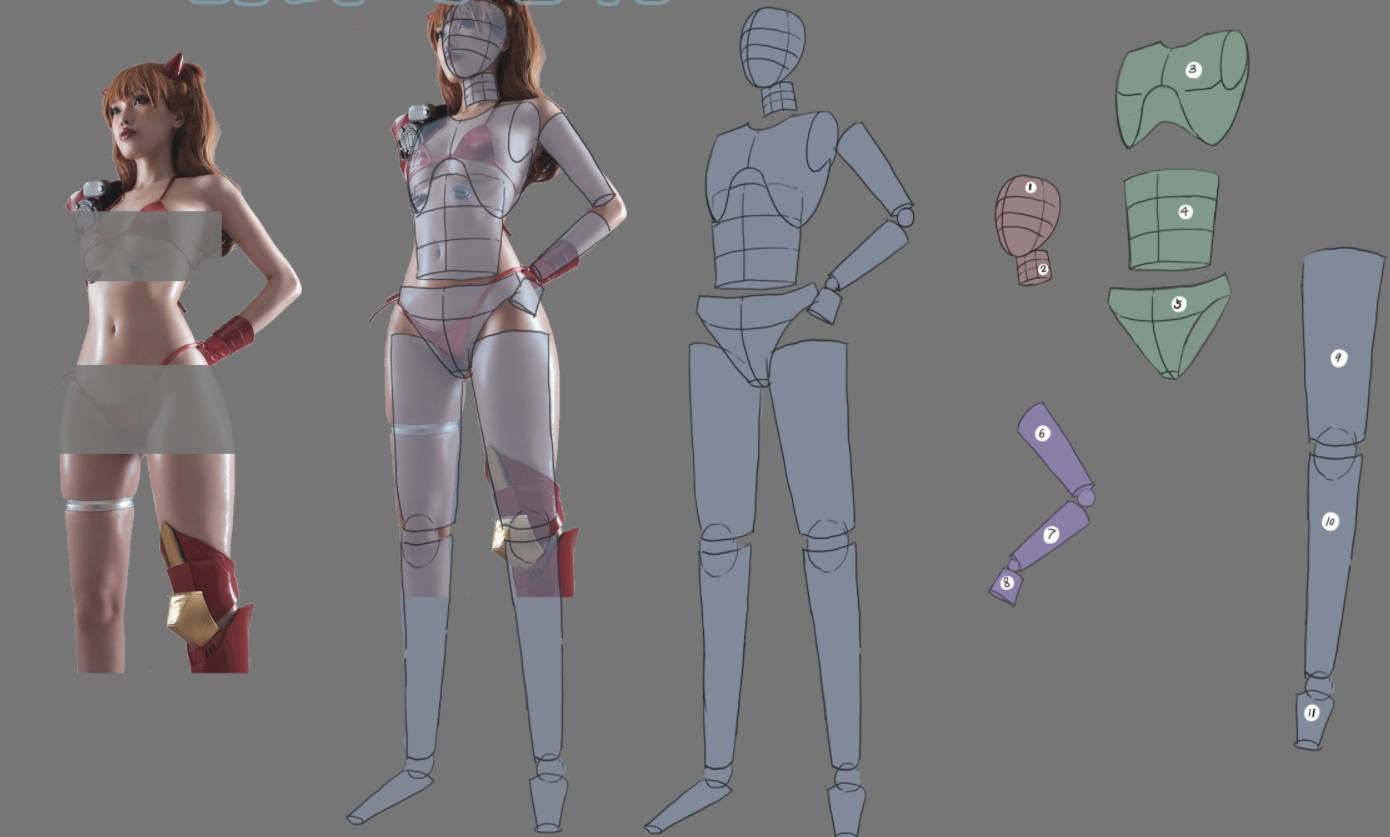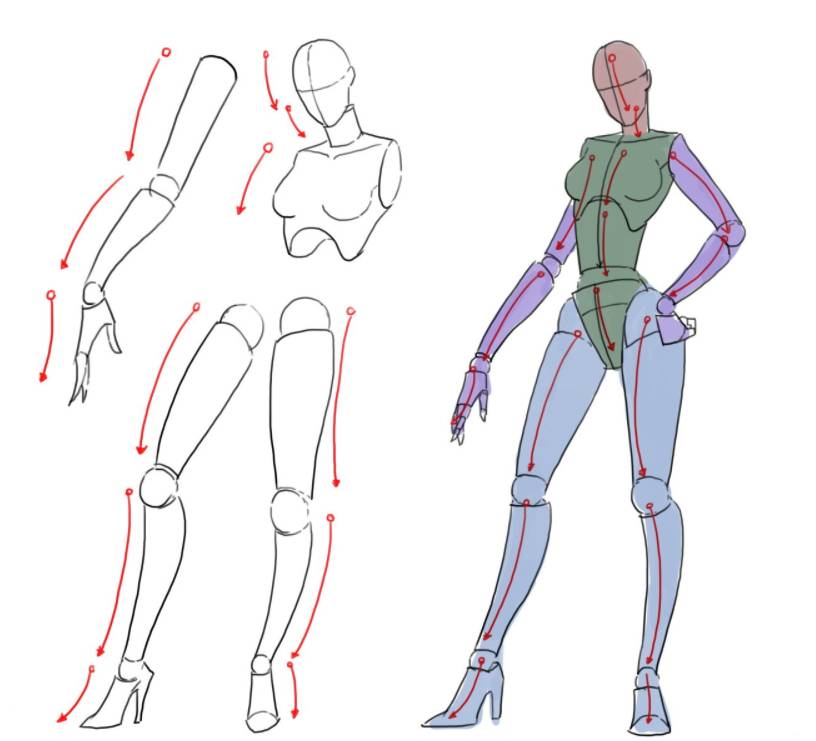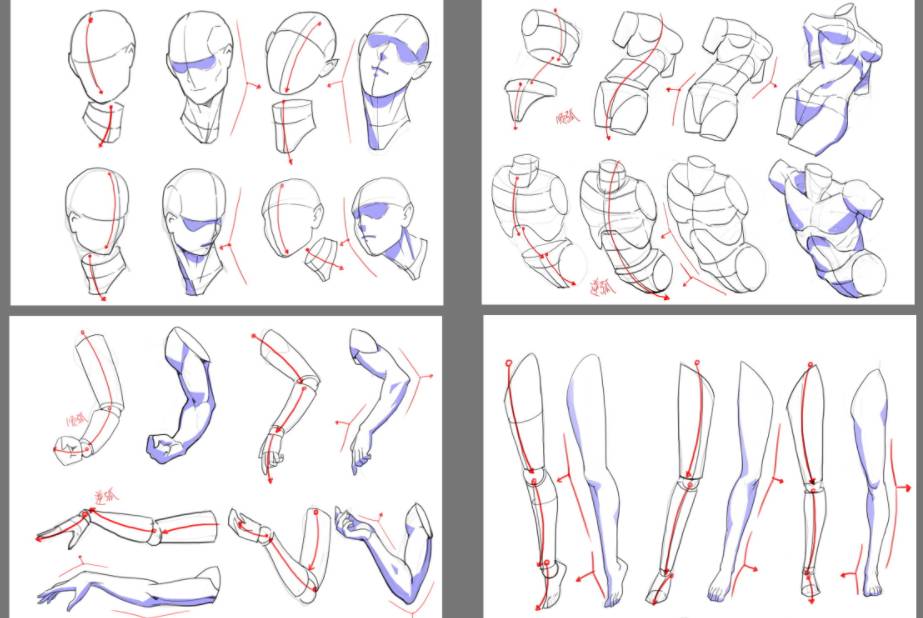 我们能从人体中分离出一些基础图形,这些图形是可以整合成四个组的,每个组又各能分成两到三个小部分,每个组以及小部分对形成运动人体释放角色“结构张力”都有着非常重要的影响。