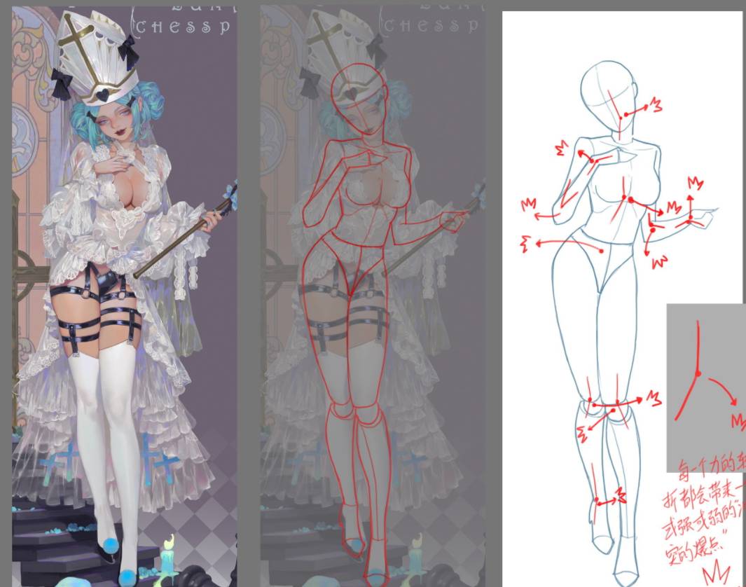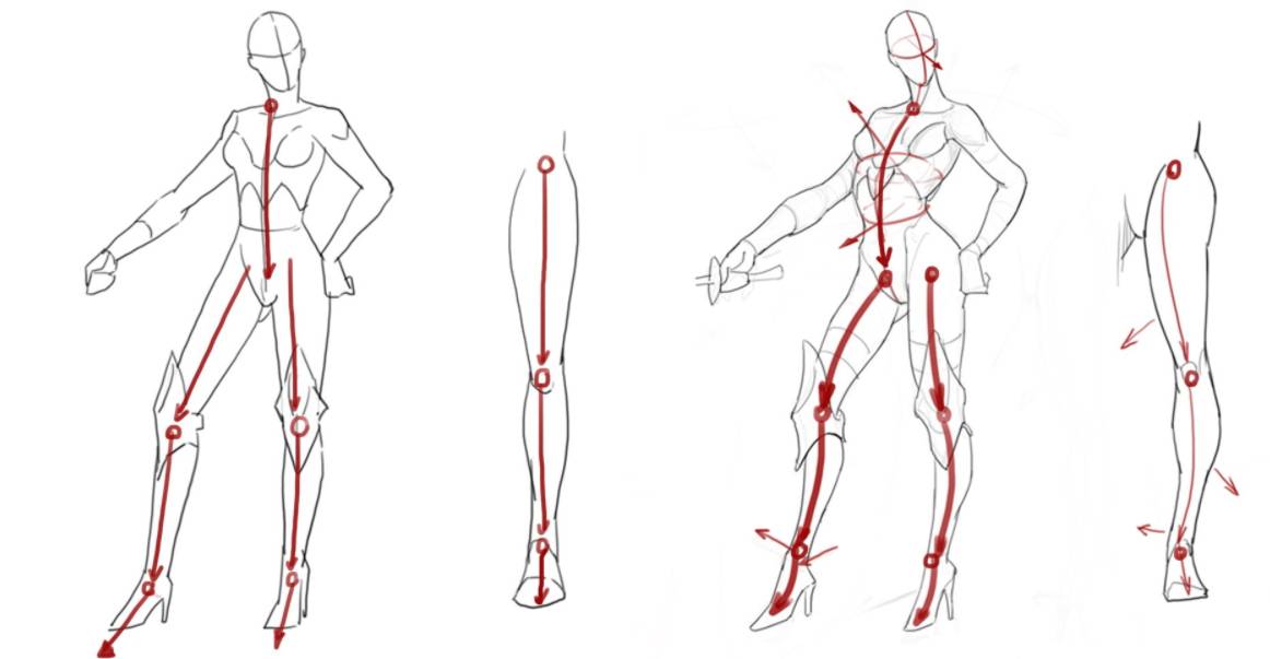 以上两张实际案例可以清楚的看到弧线在人体中的贯穿带来的张力的表现。有了“张力”,人体的动态的活跃性就会大幅增长。但是结构张力又是从哪里开始到哪里终结的呢,请看下图: