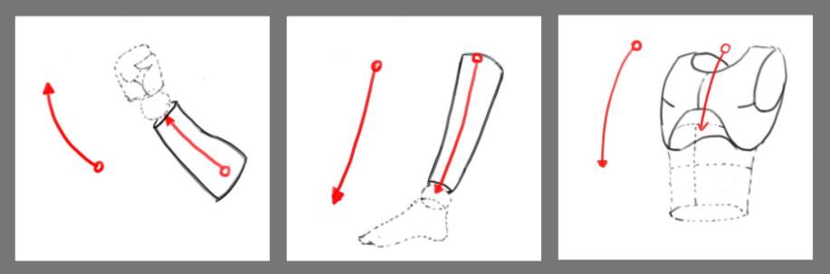 其实仔细观察人的每个肢体的部分并非直的都有一定的曲度,这跟地心引力也有着一定的关系。总之这就造成每个小箭头在人体的各个肢体区域都呈现顺弧或者逆弧的张力趋势。当然这也必须包括人的胸腔腹腔,盆腔,就是上图绿色部分的组。