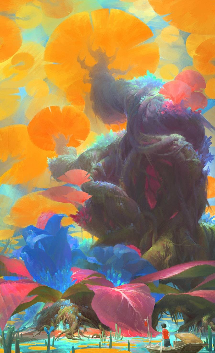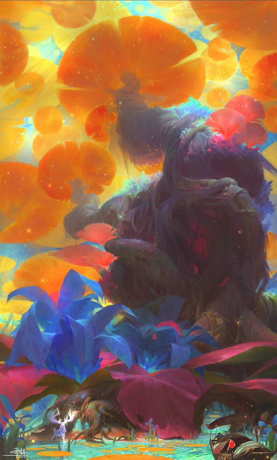 继续细化场景的构图。加入一些奇幻的环境元素,比如萤火虫,就特别充满奇幻感,但又是现实中能见到的东西。画到这里我就会想起小时候傍晚在田埂边嬉戏的画面。童年的美好回忆!感觉这辈子也许很难再体会了。接下来进步深入刻画光线和质感以及添加细节。