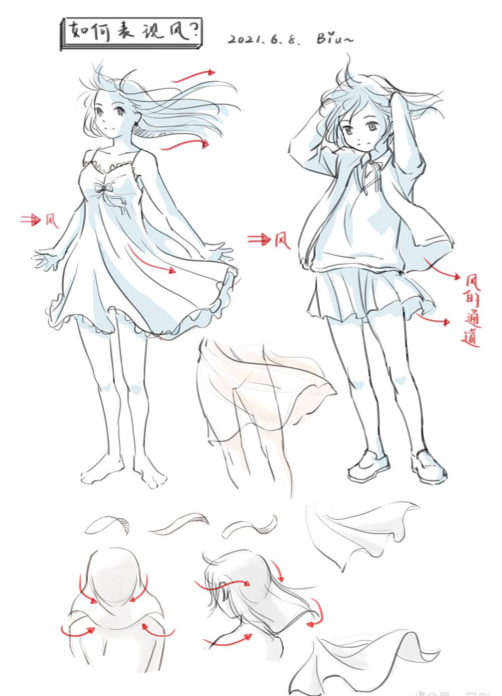 首先明确风吹来的方向,表现风的主要方式有两个:头发和布料。头发其实可以当成布料去画。