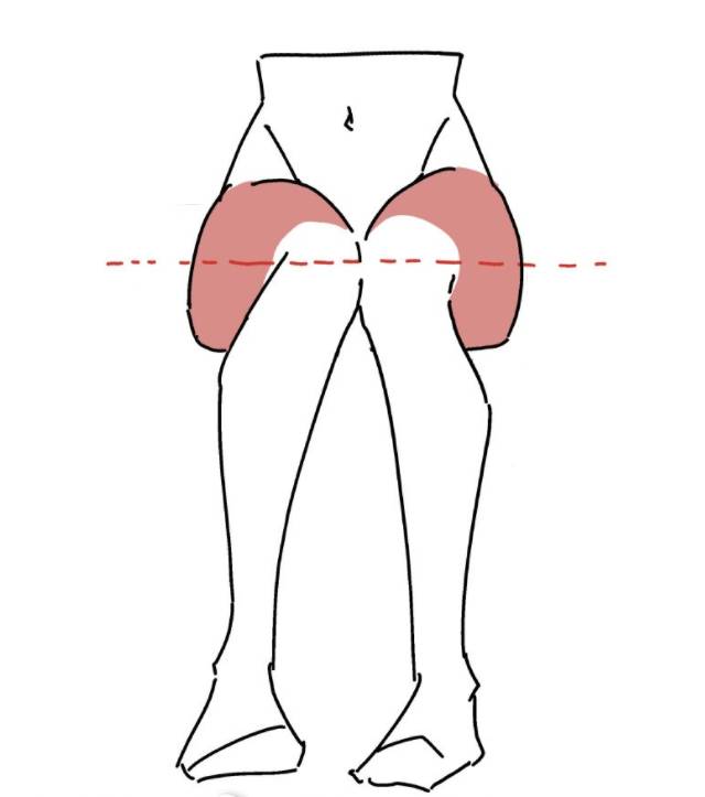 人物在坐姿的时候,大腿可见部分如下图所示的,红色那部分。膝盖位置就是图上面画的那条虚线。