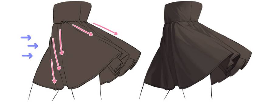 当风从前面吹来的时候,布料会向后方折叠起来,形成褶皱。