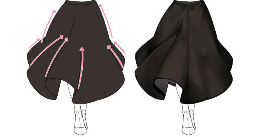 当风灌进长裙里面时,长裙会产生膨胀,而衣褶也会有相应的变化。