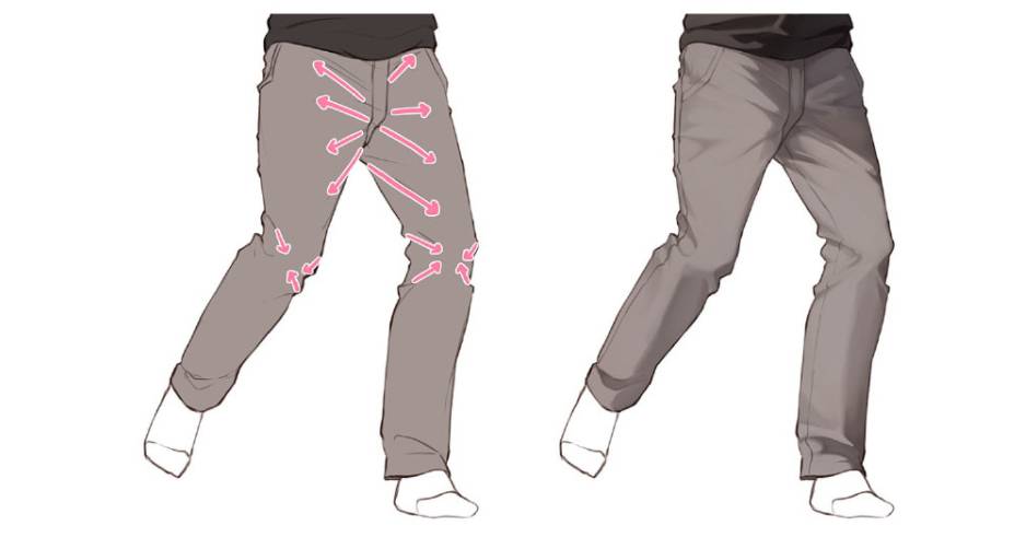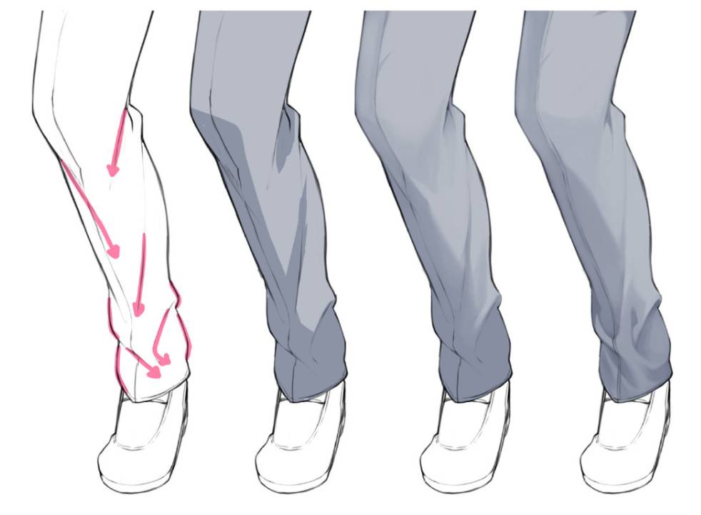 从膝盖下方开始,产生向下趋势的褶皱,并形成悬挂在脚踝周围的轮廓。在示例图片中,由于没有特殊的外力作用,所以整体的衣服褶皱是比较浅的。
