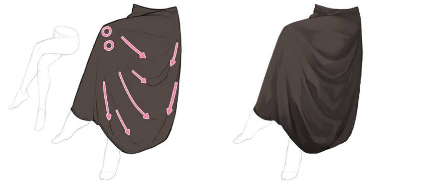 坐姿状态下的长裙,会产生一个受重力作用而产生向下趋势的褶皱,膝盖是长裙的支撑点,所以这个地方要有紧绷的感觉。