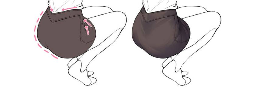 下蹲姿势下,盆骨处产生牵引力,该力会让短裙在臀部位置几乎没有产生衣褶。